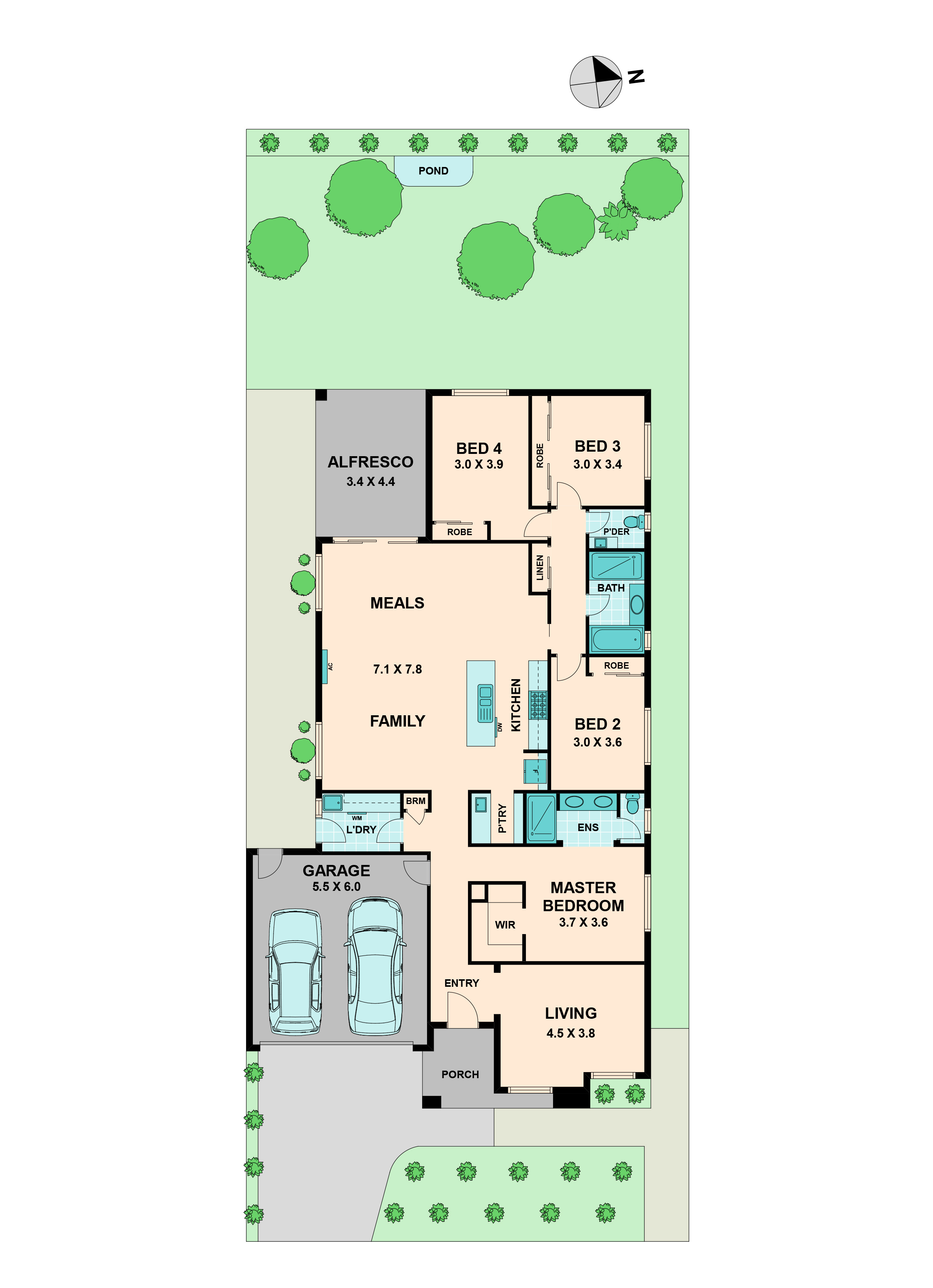 The master suite offers walk in robe and an ensuite with double vanity, shower and toilet. A further three bedrooms can be found down the hallway all with built in robes and serviced by the main bathroom plus a powder room.