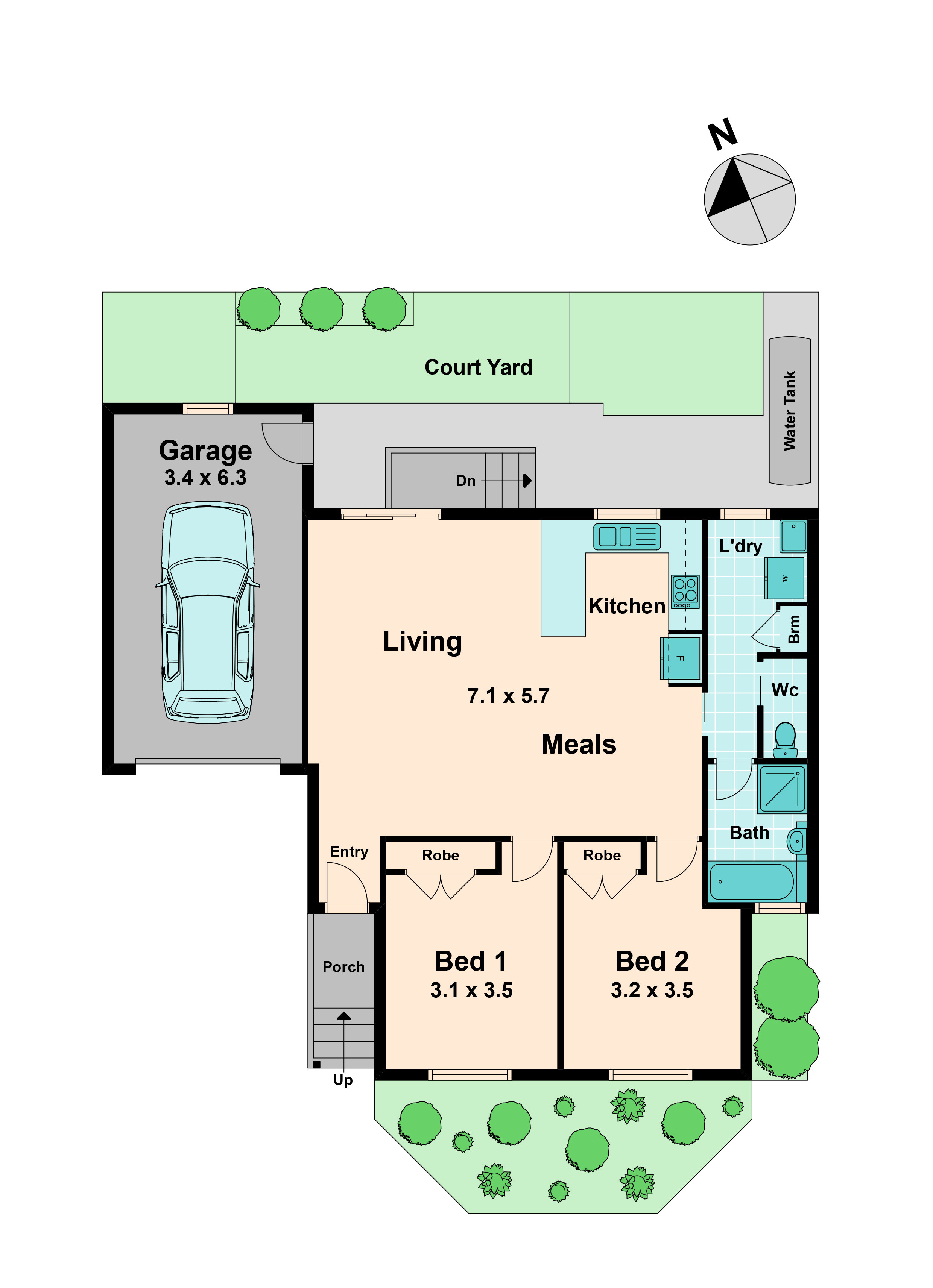 A well equipped kitchen opposite a 3.6 by 3.5 dining offers ample bench top space and cupboard storage. Sliding door access from the dining leads to a low maintenance courtyard with water tank and access to single remote lockup garage.